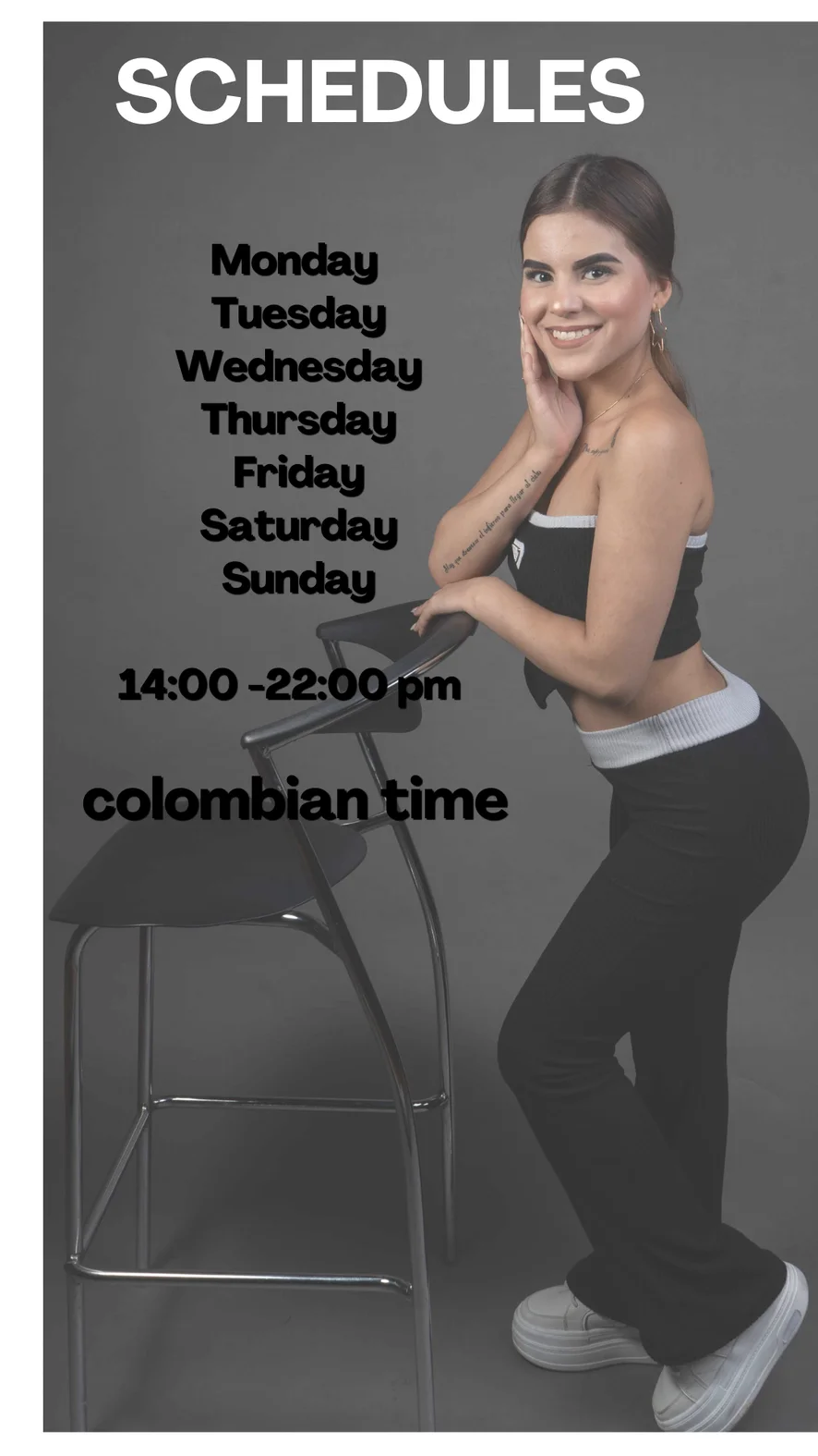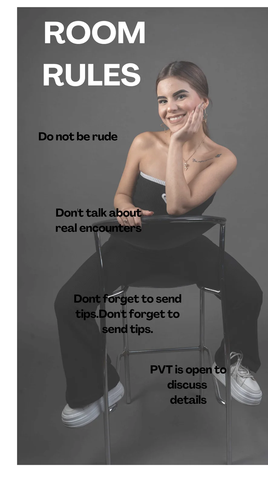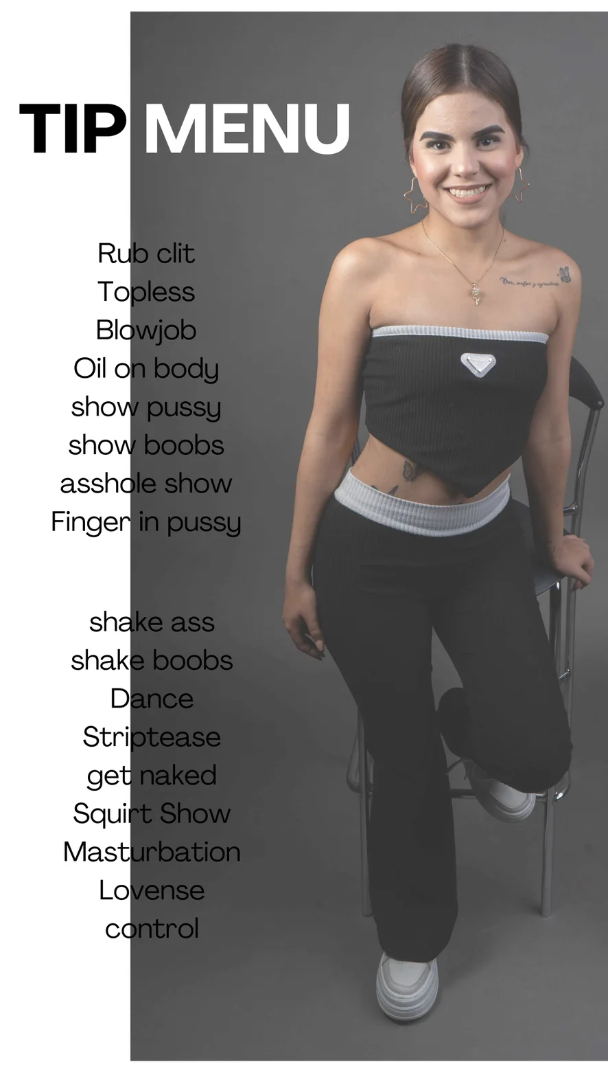 Ahegao, Kutyapóz, Fenekelés, Erotikus tánc, Tevepata, Ujjazás, Sztriptíz, Lábfétis, Szerepjáték, Szopás, Félmeztelen, Twerk, Magassarkú, Spriccelés, Olajozás, Hardcore, 69-es pozíció, Lábmunka, Maszturbálás, Dildó vagy vibrátor, Anál, Fenékből szájba, Mocskos beszéd, Dupla behatolás, Cigizős, Mély torok, Megalázás, Mellbimbó izgatók
